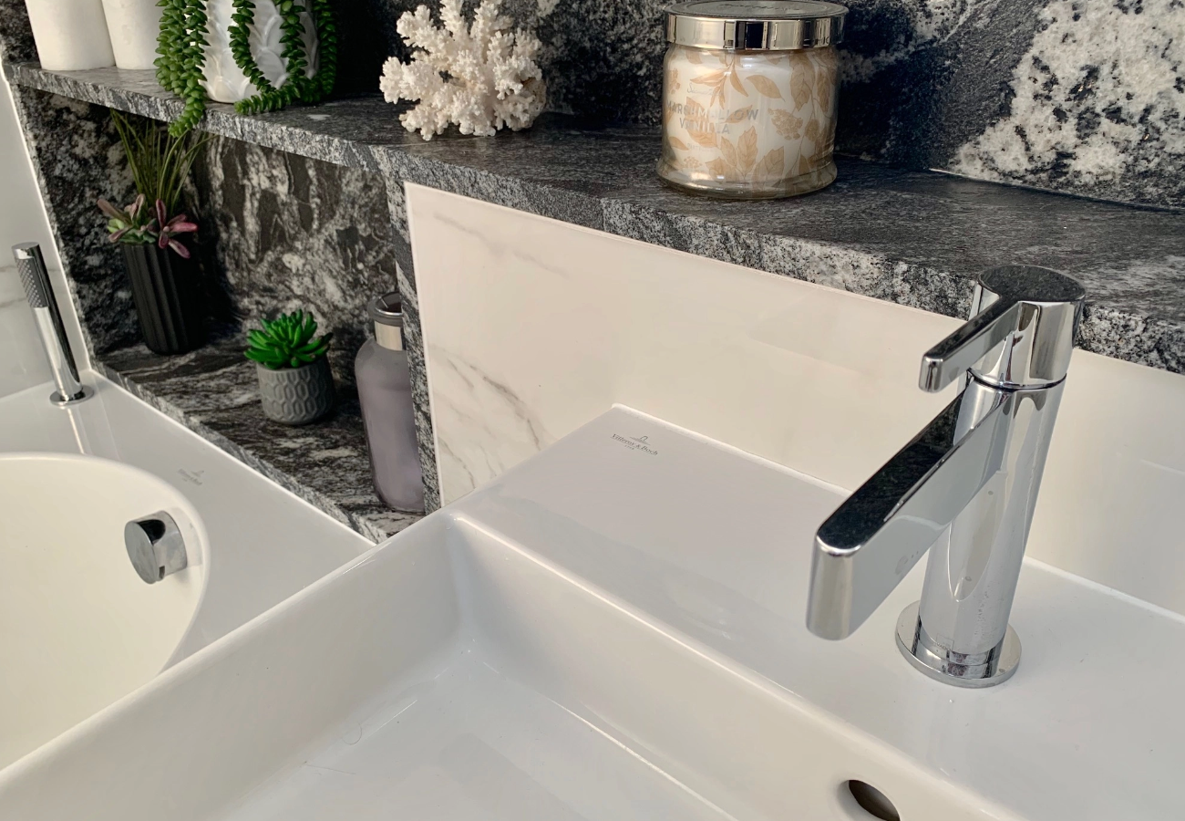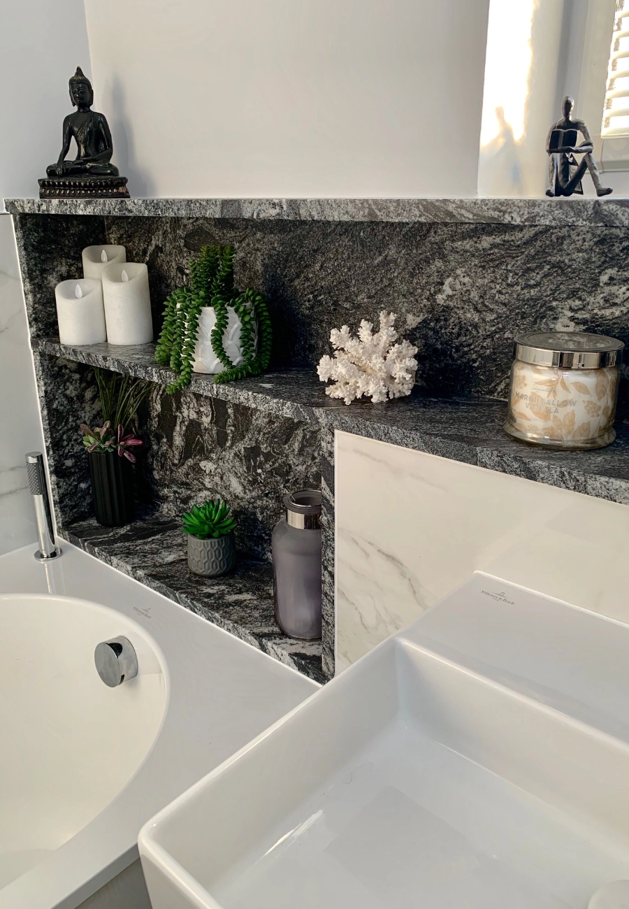 The most remarkable and standout feature of this beautifully appointed bathroom is undoubtedly the masterful implementation of Sensa Granite in the exquisite Black Beauty finish. This premium material has been expertly utilised to create both elegant window sills and bespoke floating shelves, providing ingenious additional storage solutions whilst maintaining the refined aesthetic. This clever design approach has transformed what could have been a challenging small space into a highly functional yet visually impressive sanctuary.