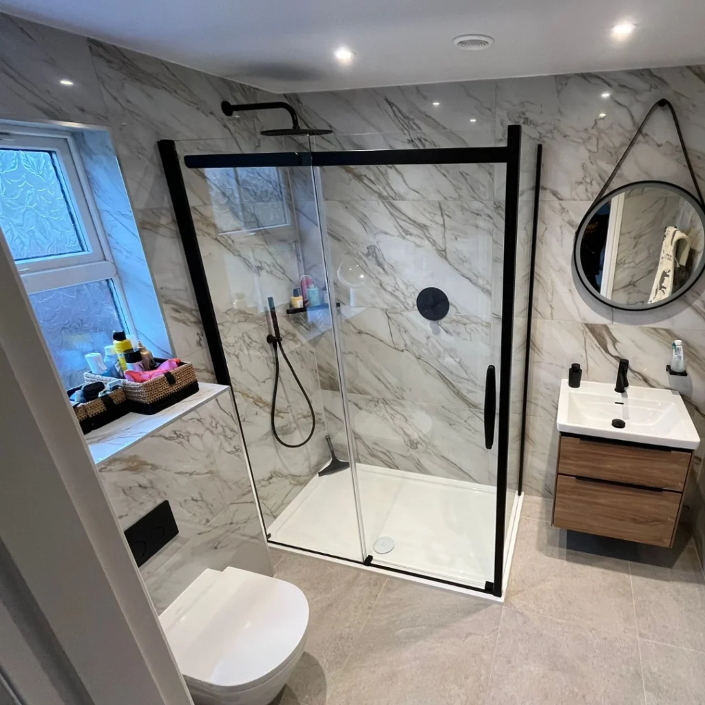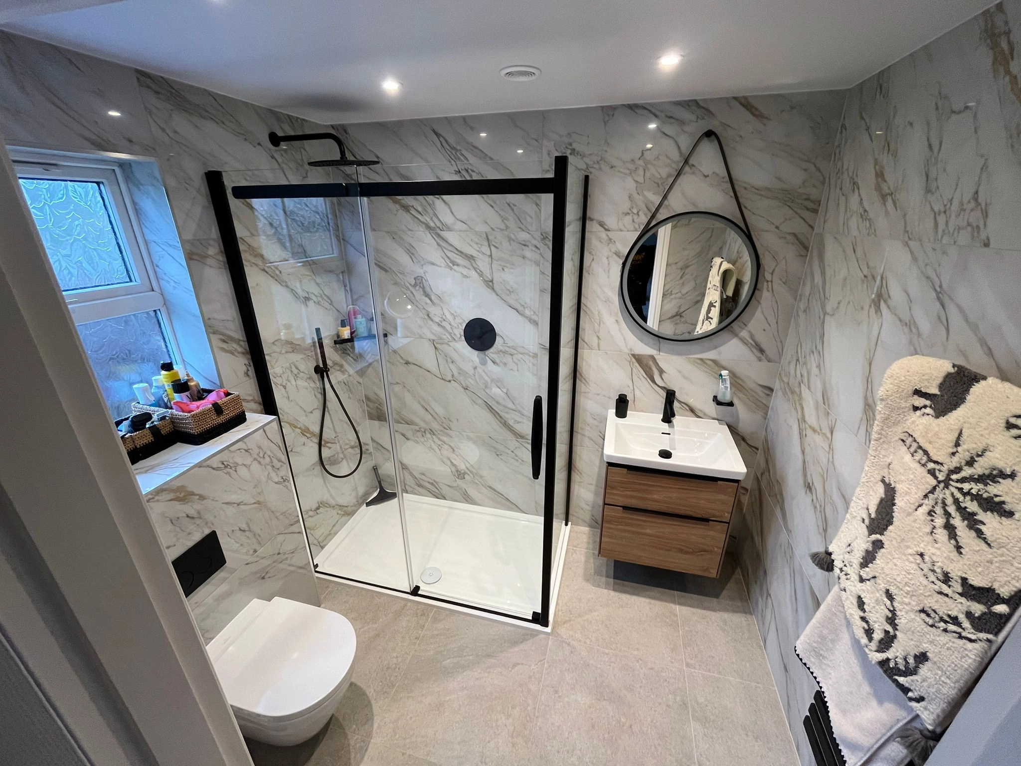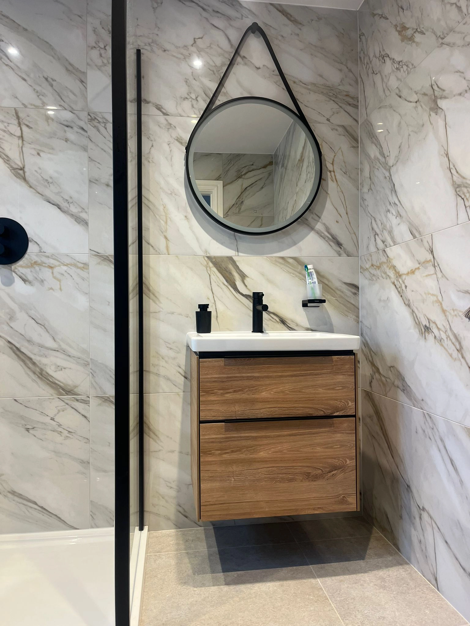 Step into a world of timeless elegance with this striking black and white bathroom design. Monochrome never goes out of style, and this carefully curated scheme proves exactly why — pairing crisp, clean lines with rich natural textures to create a space that feels both bold and refined. Every product has been hand-selected to work in perfect harmony, from the statement tiling through to the luxurious brassware, delivering a bathroom that is as functional as it is breathtaking.