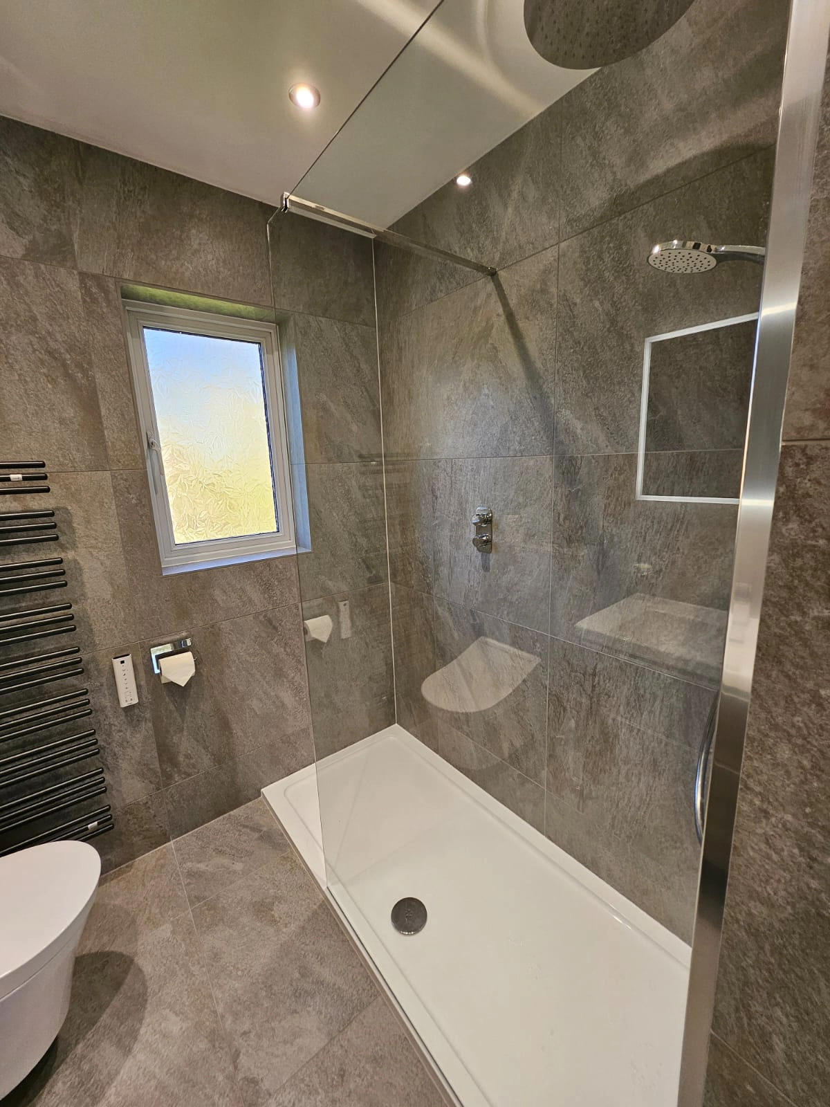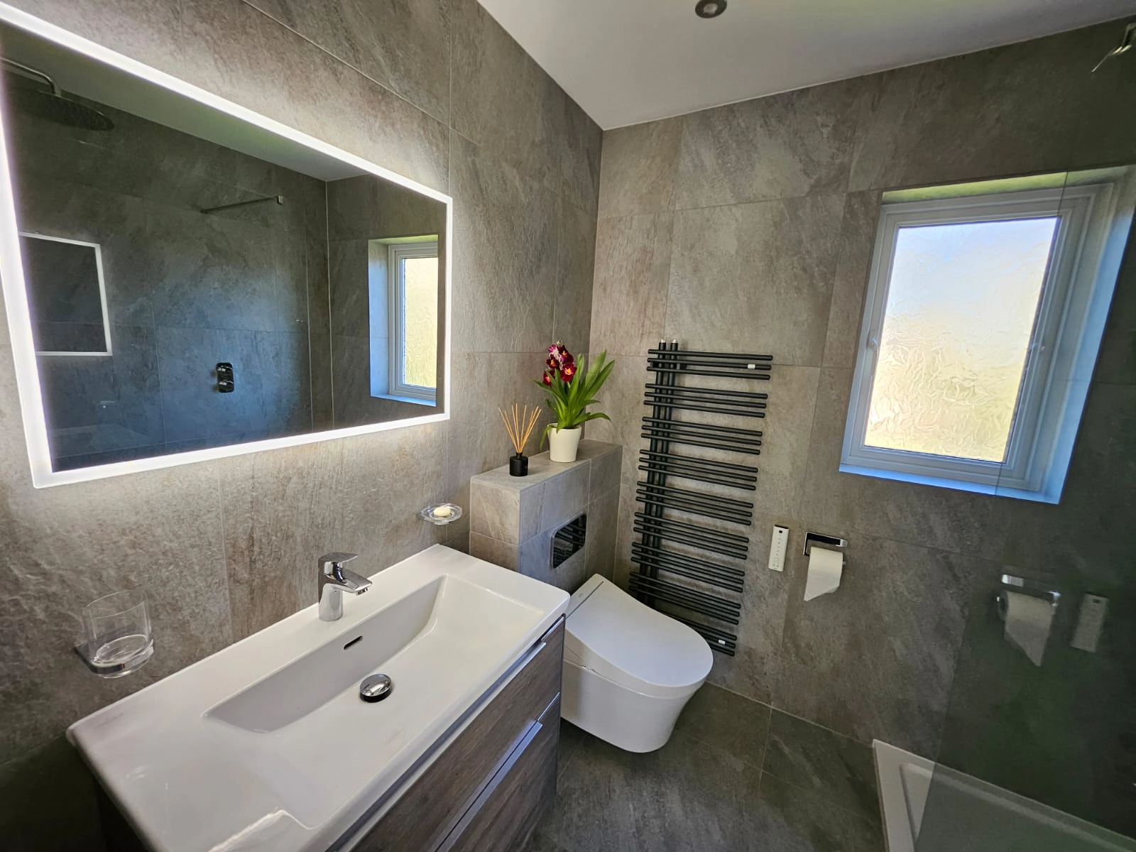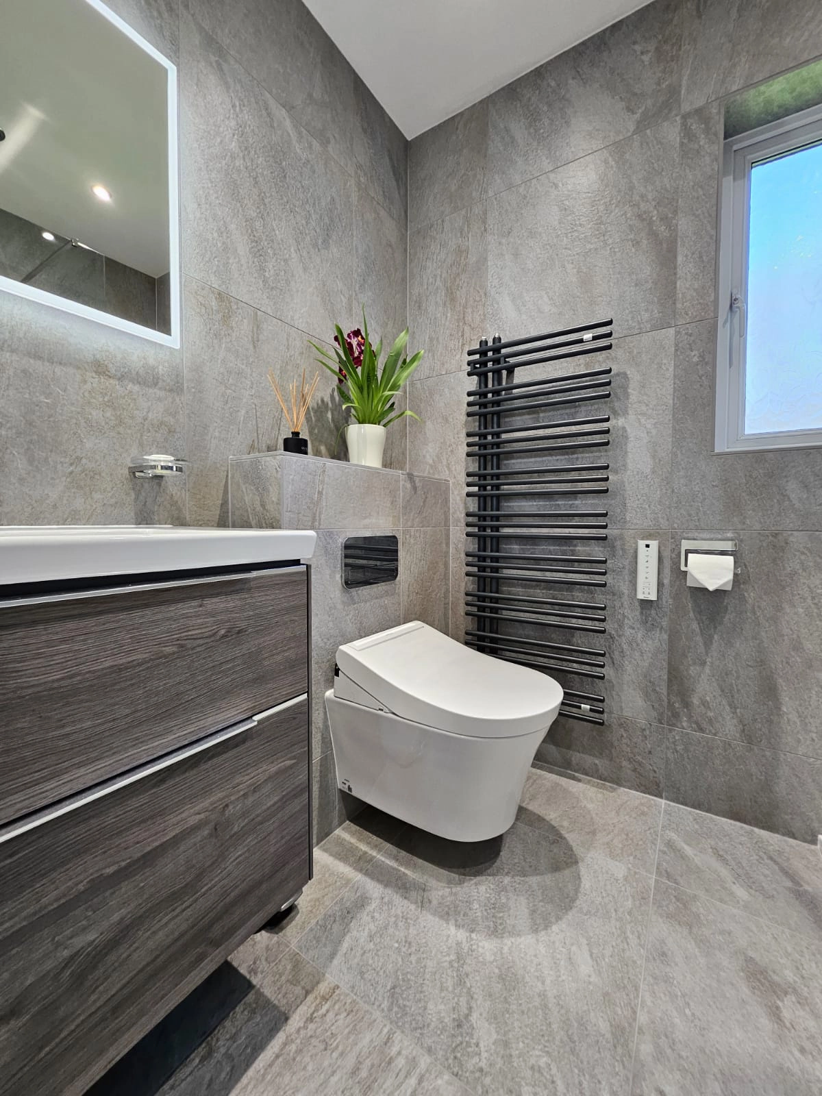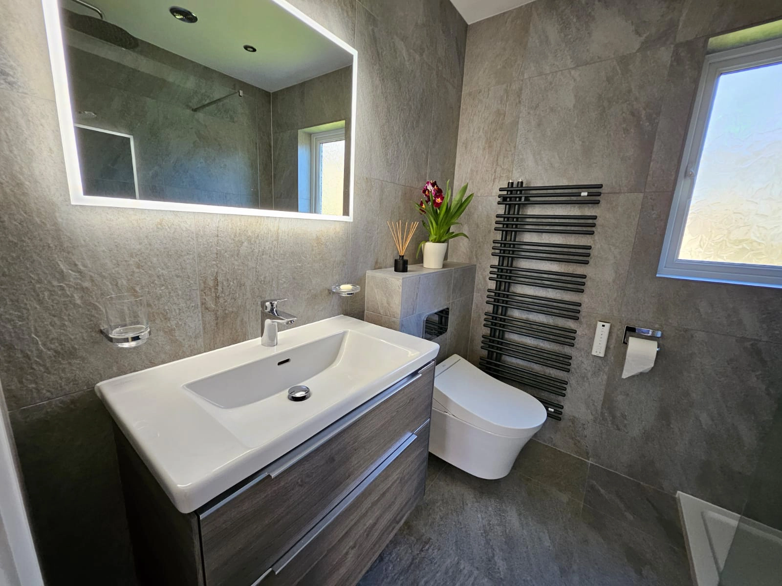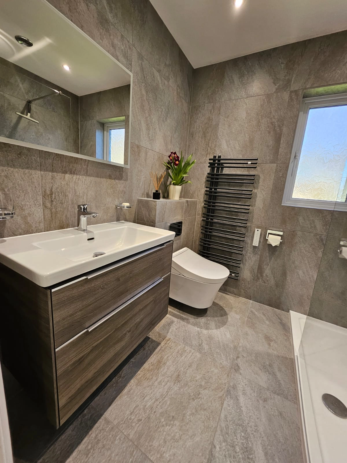 This contemporary bathroom design brings together premium fixtures and fittings to create a sophisticated, cohesive space. The foundation is set with Villeroy & Boch Grey My Earth tiles, which provide a natural, earthy aesthetic throughout. A TOTO wall-hung WC offers sleek, space-saving functionality with the brand’s renowned quality and innovation. The Villeroy & Boch Subway 3.0 basin and vanity unit combines clean, modern lines with practical storage, maintaining the minimalist approach. Vado brassware adds the perfect finishing touch with its elegant taps and accessories, whilst a Flair shower screen completes the room with crystal-clear separation that maintains the sense of openness and light. Together, these carefully selected elements create a bathroom that balances timeless design with modern functionality.