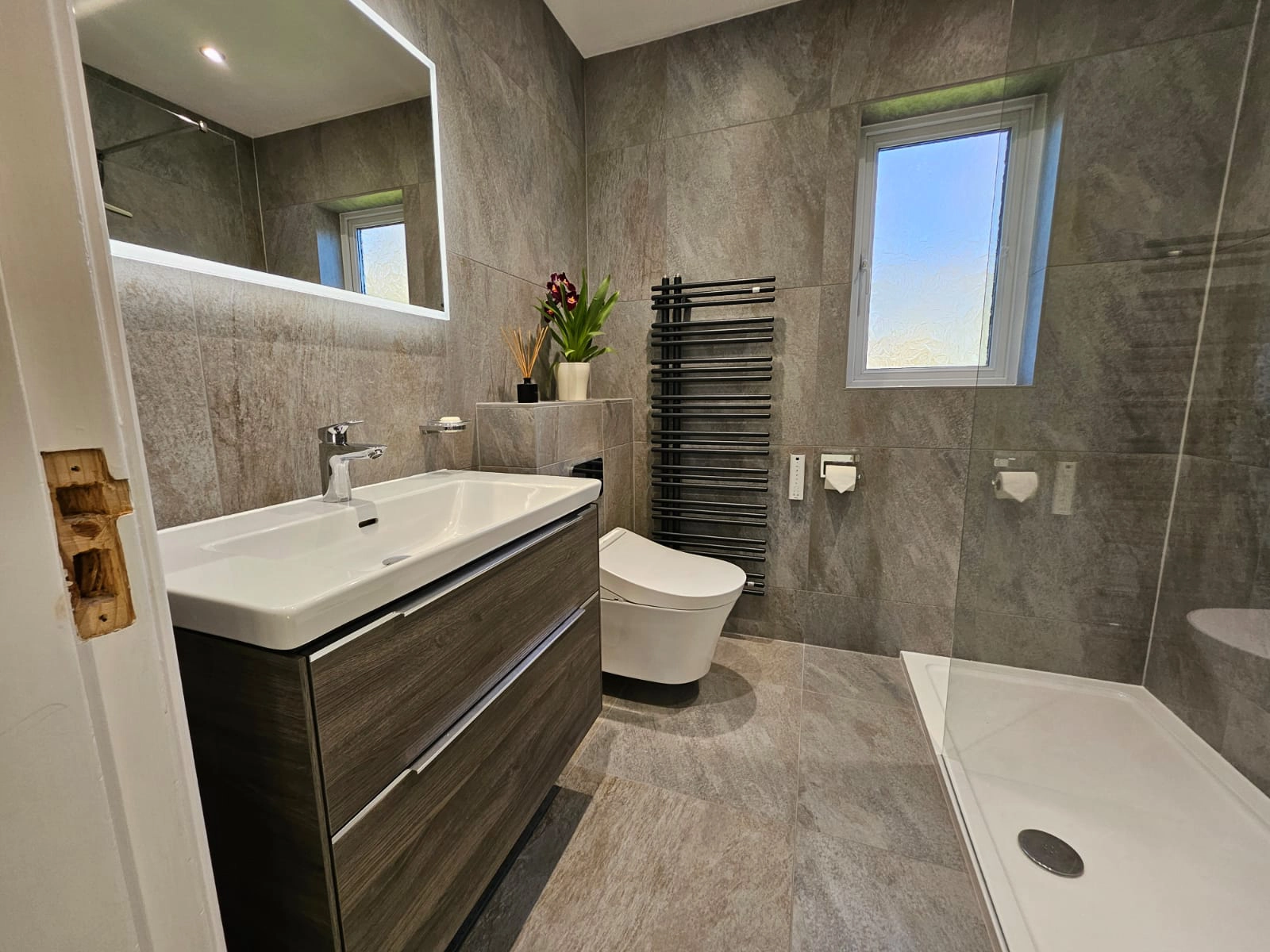 Utilising Tiles and New Brassware we transformed this room into a luxury bathroom with a state-of-the-art W/C.